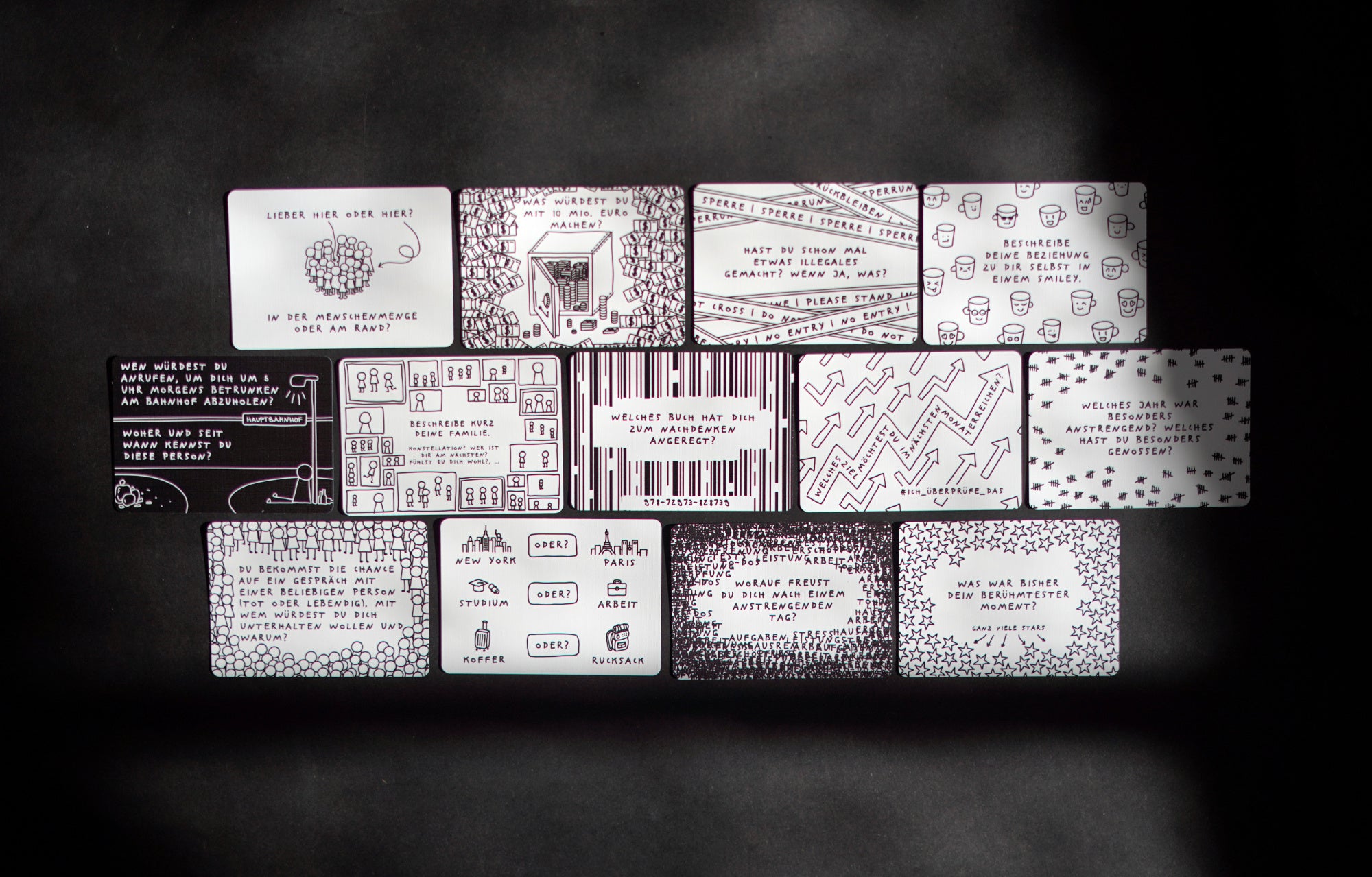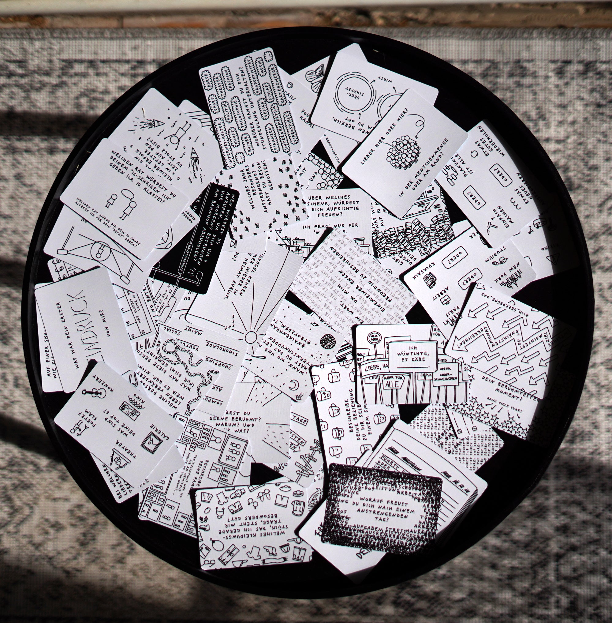 Dieses Kartendeck habe ich aus dem Grund entworfen, weil mir die ewigen, oberflächlichen Gespräche auf Partys, beim Kennenlernen und in der Beziehung auf den Zeiger gingen. So habe ich angefangen, interessante Fragen zu sammeln; dabei sind über 3 Jahre eine beträchtliche Anzahl an Fragen zusammengekommen. Von witzig, über melancholisch zu interessant. Alles dabei. Ins Deck haben es natürlich nur die besten 100 Fragen geschafft. Anfangs habe ich das Spiel nur mit meinen Freunden gespielt, aber nachdem ich oft gefragt wurde, wo das Spiel zu kaufen sei, habe ich mich jetzt dazu entschlossen, es zu veröffentlichen.